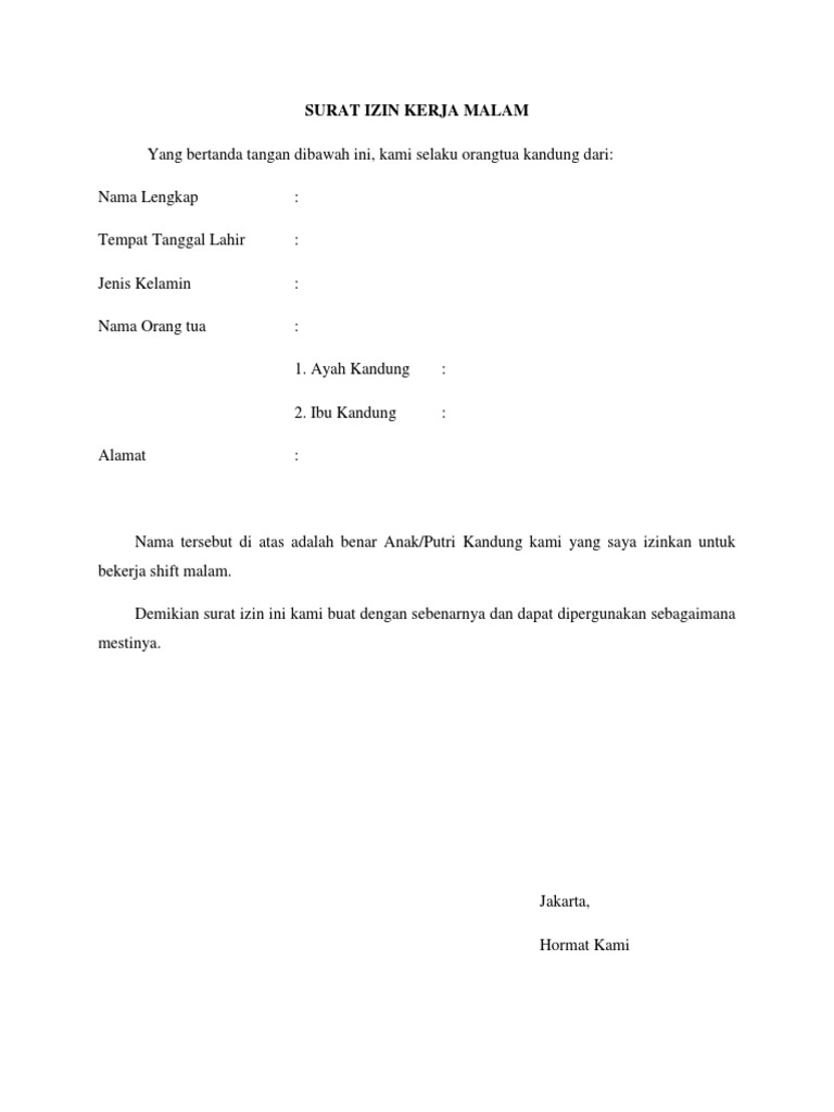 Contoh Surat Izin Kerja Malam Dari Orang Tua