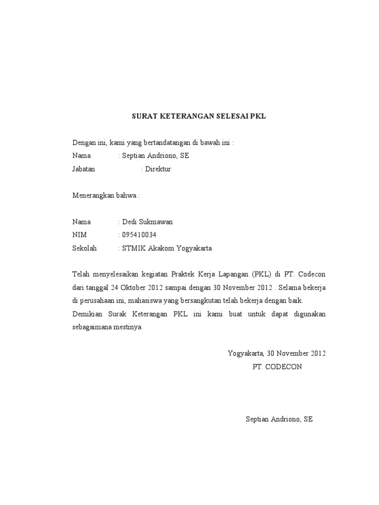 Contoh Surat Keterangan Selesai Pkl Koleksi Dokumentasi