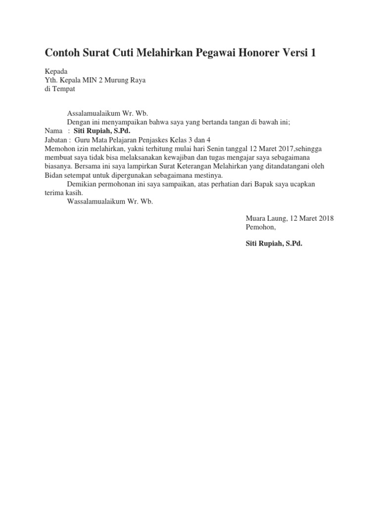 Contoh Surat Cuti Melahirkan Pegawai Honorer Versi 1 Docx