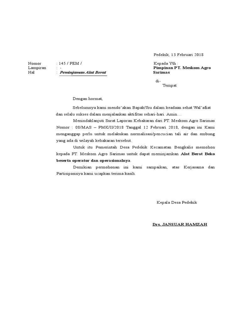 Contoh Surat Peminjaman Alat Berat