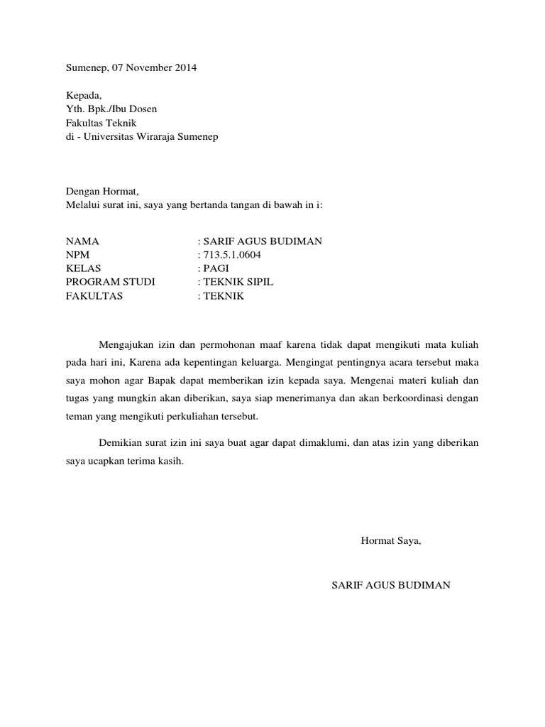 Contoh Surat Izin Tidak Masuk Kuliah Karena Acara Keluarga