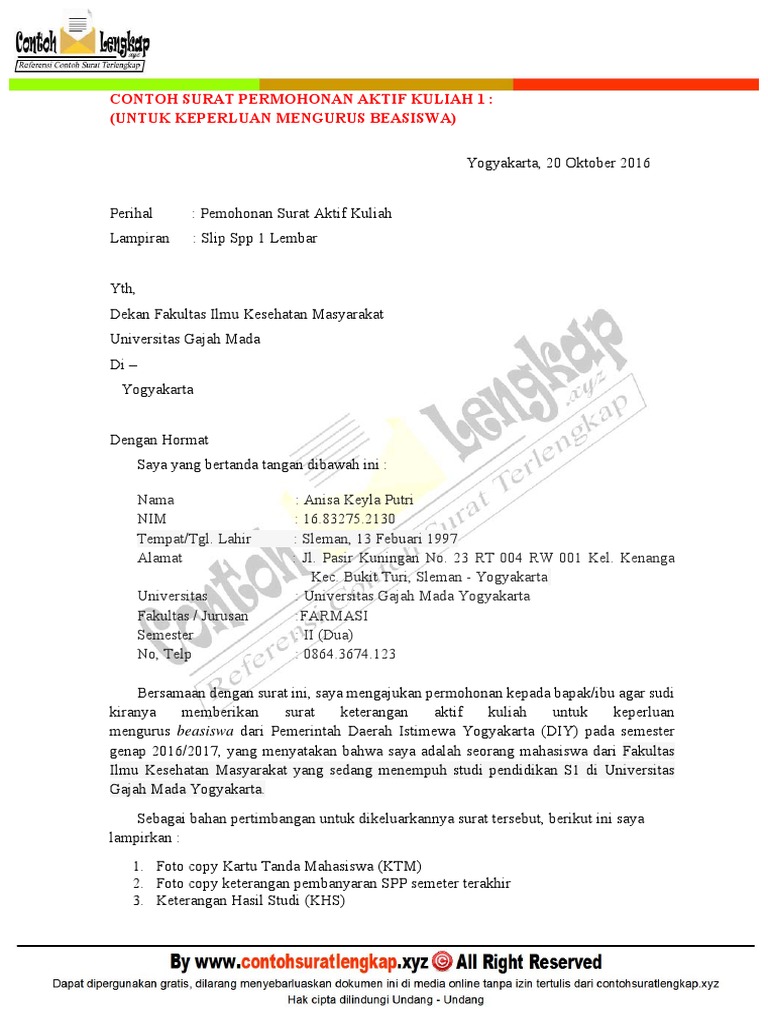 Cohtoh Surat Permohonan Aktif Kuliah