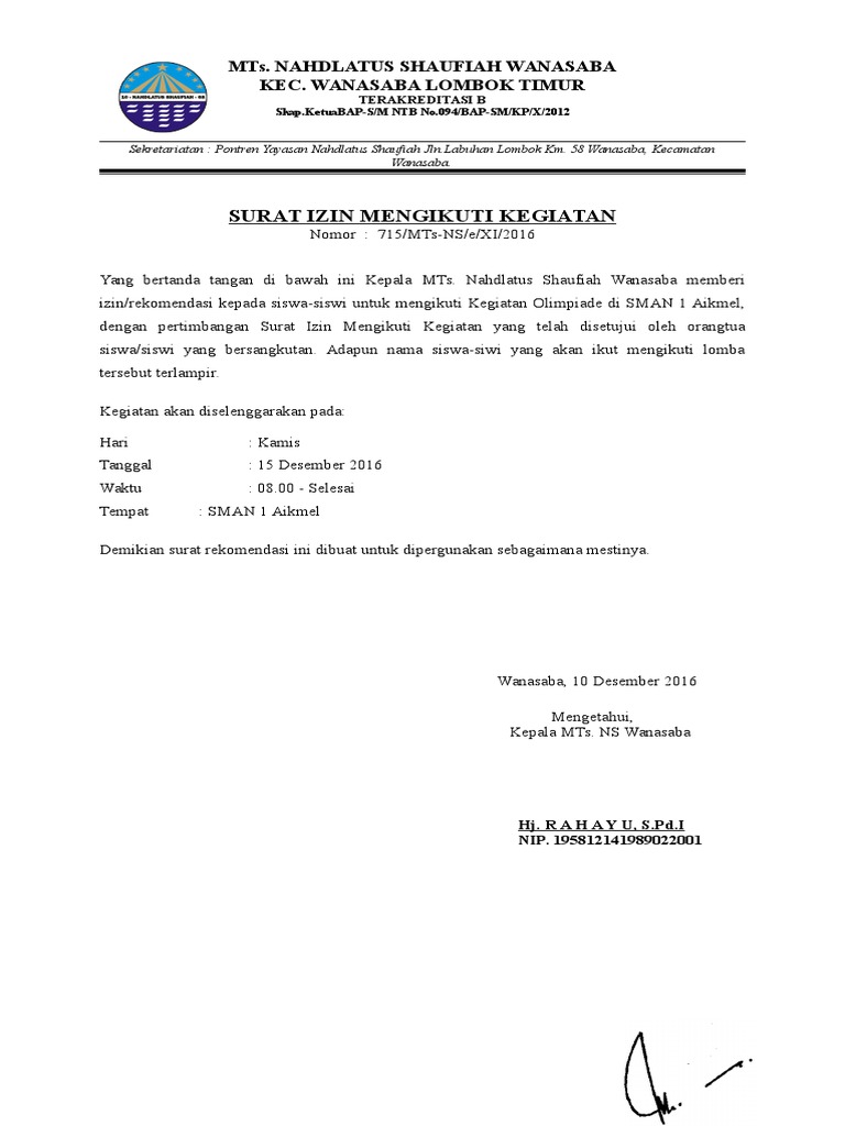 Contoh Surat Izin Ke Sekolah Untuk Mengikuti Kegiatan Bagi