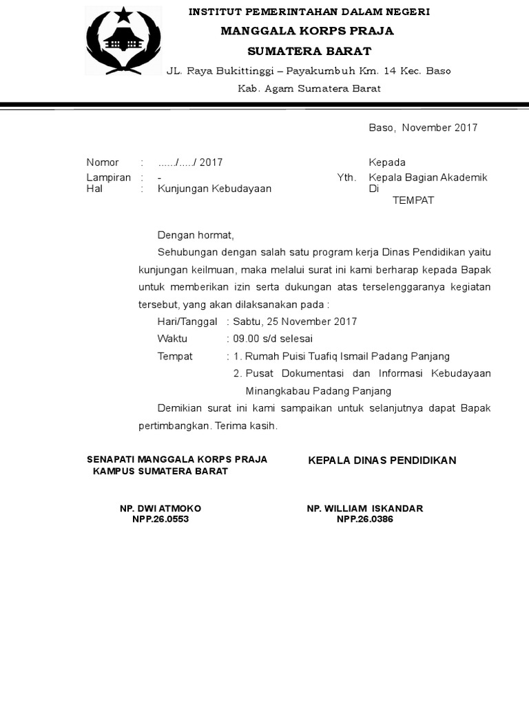 Contoh surat izin kegiatan surat permohonan izin merupakan surat yang ditujukan kepada pihak tertentu yang berisikan permohonan izin untuk meminjam menggunakan menyewa sebuah tempat atau bangunan tertentu yang akan digunakan sebagai tempat untuk berlangsungnya sebuah acara. Contoh surat dinas resmi sekolah setiap kegiatan sekolah yang bersifat resmi biasanya disertai dengan dikeluarkannya surat resmi. Baik itu surat yang dipergunakan oleh perusahaan instansi pemerintahan lembaga organisasi dan perseorangan.