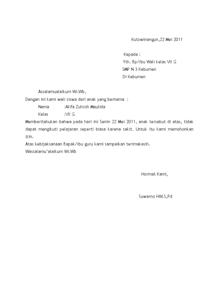 Contoh Surat Ijin Orang Tua Wali Murid Anak Tidak Bisa Masuk
