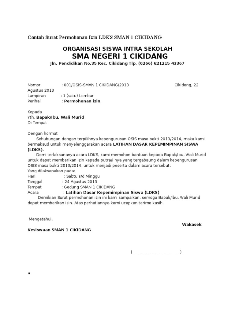 Contoh Surat Izin Kegiatan Osis Di Sekolah Lengkap