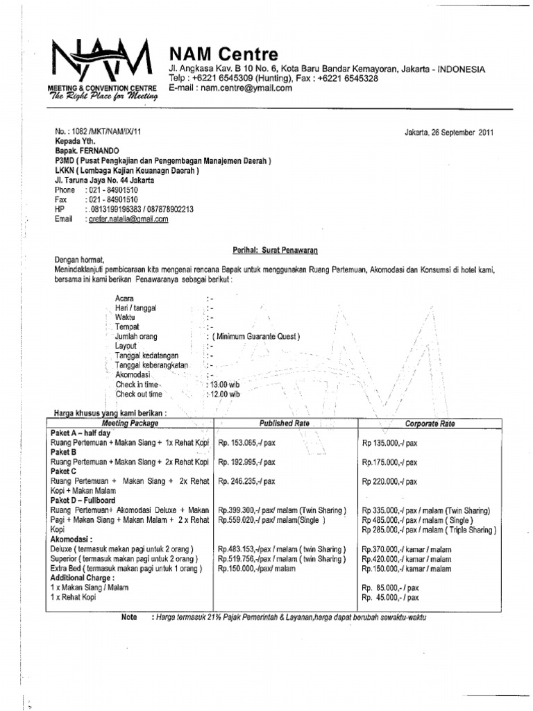 Surat Penawaran Paket Meeting Nam Centre Hotel P3md