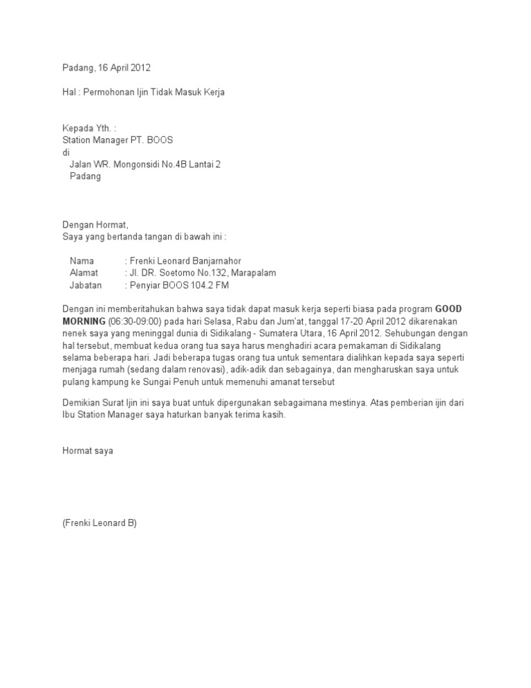 Contoh Surat Izin Tidak Masuk Kerja Yang Benar 2019 Contoh Surat
