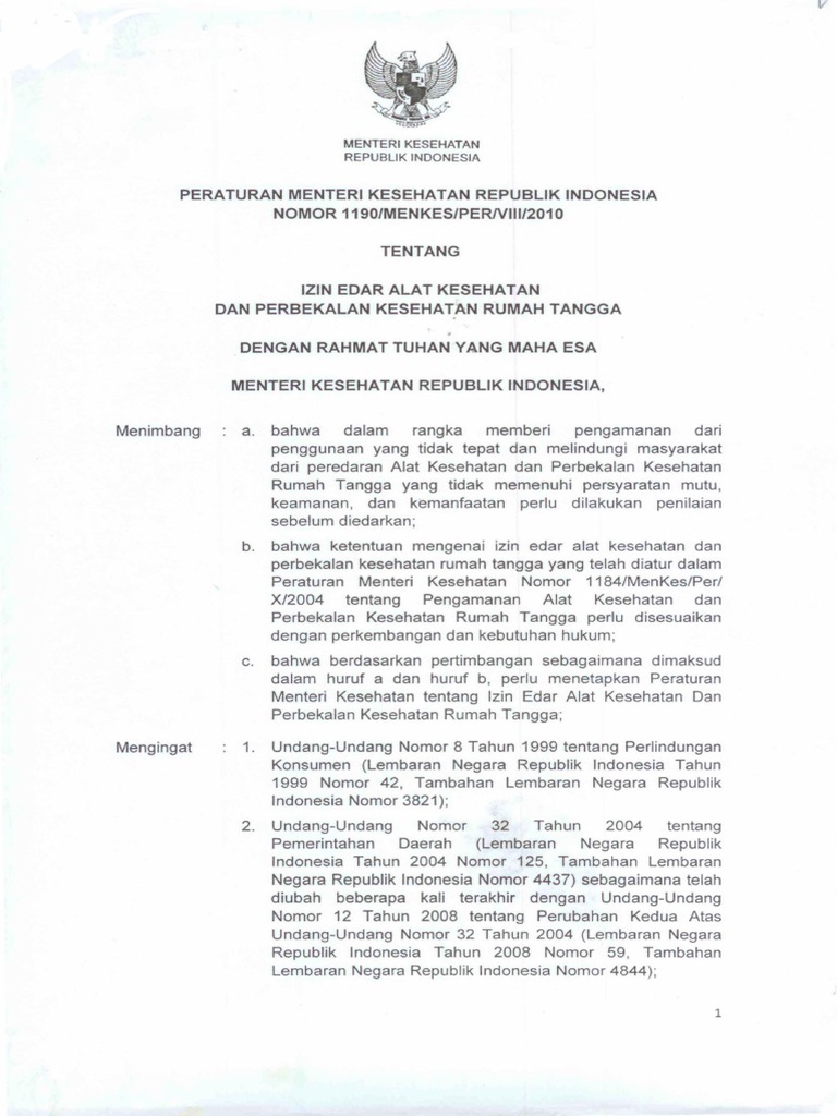 Permenkes No 1190 Tahun 2010 Tentang Izin Edar Alat Kesehatan