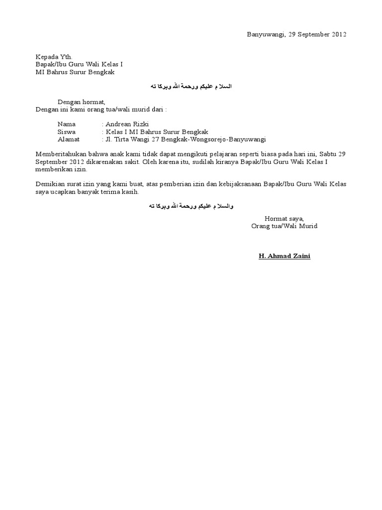 Contoh Surat Izin Tidak Masuk Sekolah Docx Document