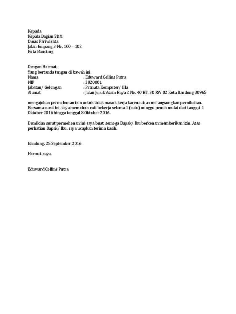 Contoh Surat Cuti Menikah Untuk Pns
