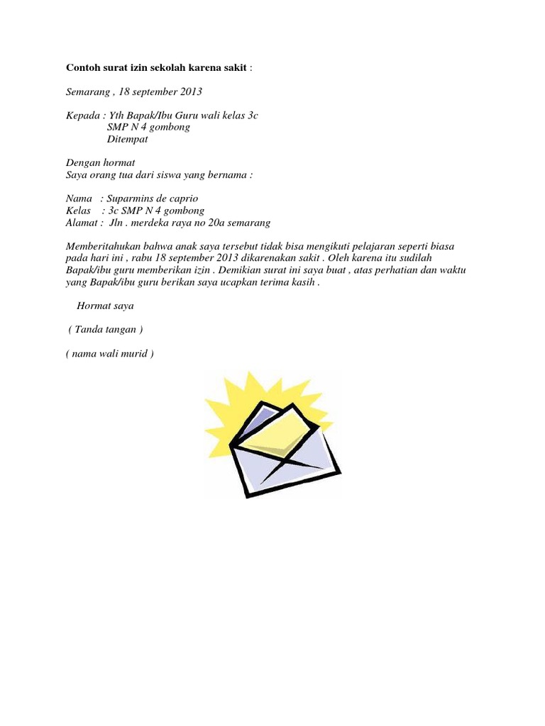 Contoh Surat Izin Tidak Masuk Sekolah Karena Sakit Dengan Salam