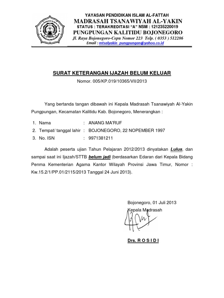 Surat Keterangan Ijazah Belum Keluar Mts